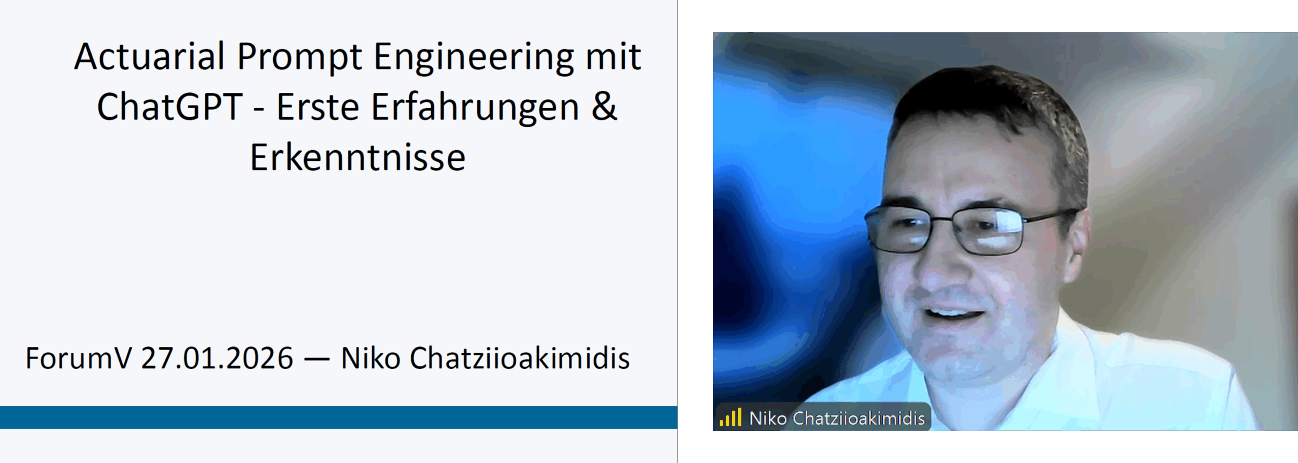 Herr Niko Chatziioakimidis, Abteilungsdirektor Mathematik & Aktuar bei der uniVersa, referierte im Rahmen der Veranstaltung zum Thema „Actuarial Prompt Engineering mit ChatGPT – Erste Erfahrungen & Erkenntnisse“. Anhand eines Demoprojekts – dem schrittweisen Aufbau eines BU-Tarifrechners in Excel/VBA – zeigte Herr Niko Chatziioakimidis, wie sich ein LLM als Co-Pilot in aktuariellen Aufgaben einsetzen lässt. Im Fokus standen „Good Practices“ beim Prompten, insbesondere die Zerlegung komplexer Probleme in Teilaufgaben sowie die Absicherung der Ergebnisse durch Safety Checks und Verständnisfragen. Abschließend demonstrierte er den Tarifrechner live und fasste die wichtigsten Kernaussagen zusammen.